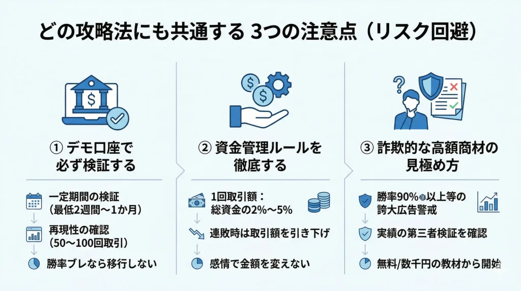 ここでは、どの攻略法を選ぶ場合にも共通して守るべき3つの注意点を、リスク回避の観点から解説します。これらを押さえることで、資金を守りながら検証と改善を進めることができます。