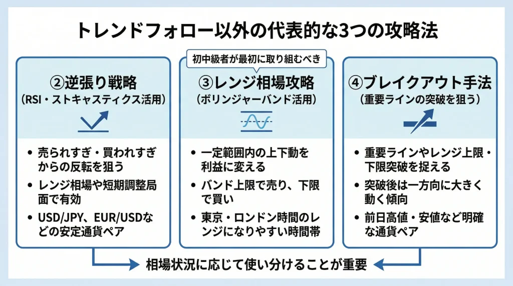 トレンドフォロー手法、RSI逆張り手法、資金管理重視法の3つは、テクニカル指標の読み方が比較的シンプルで、1〜2週間程度の学習で実践に移せる特徴があります。