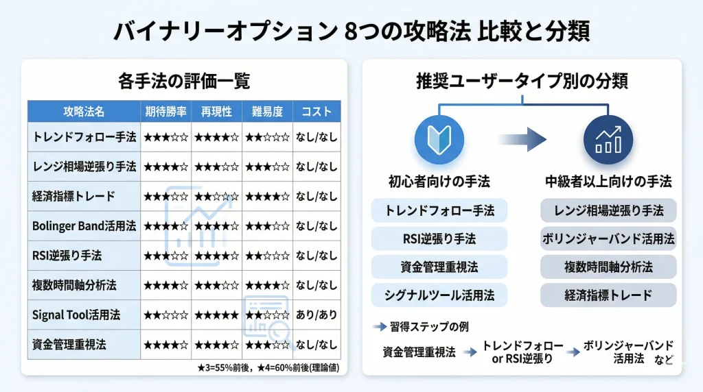 このセクションでは、代表的な8つの手法を勝率・再現性・難易度・コストの4軸で比較し、自分に適した攻略法を選ぶための判断材料を提供します。