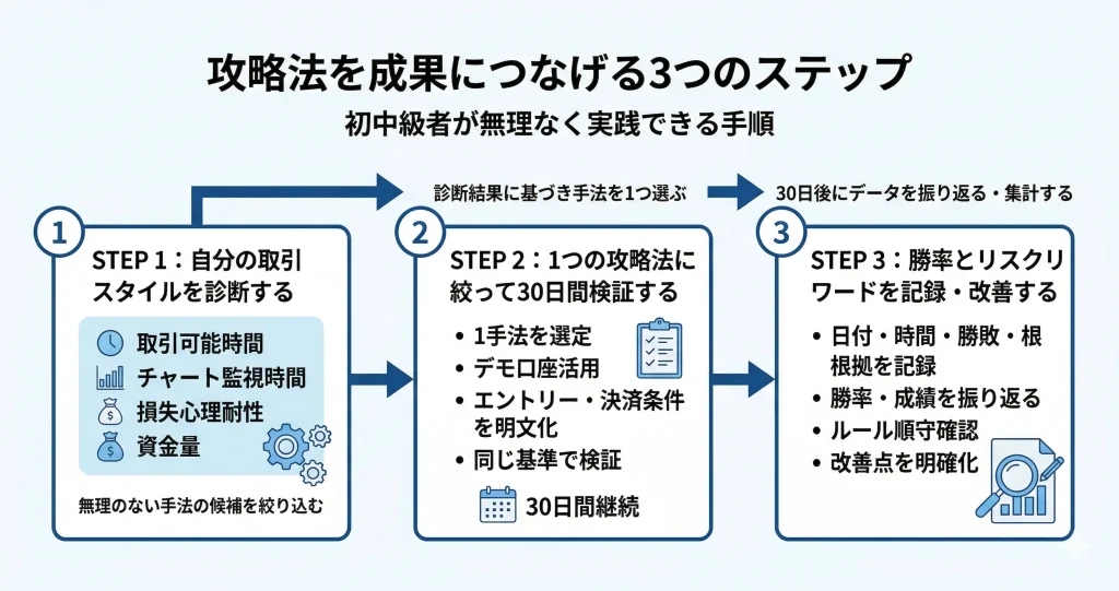 ここまでのステップを実行すれば、自分に合った攻略法を選び、検証し、改善するサイクルが回せるようになります。