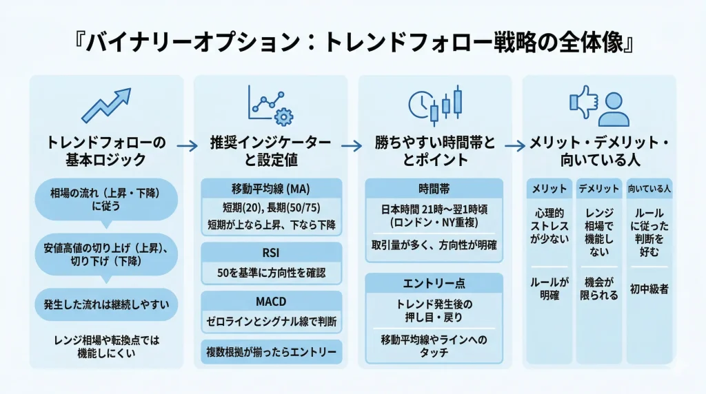 トレンドフォロー戦略は、価格が一定方向に動いている流れに乗って取引する手法で、バイナリーオプション攻略の基本となります。