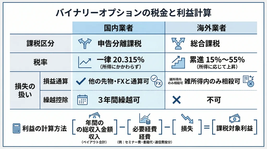 国内で金融庁の登録を受けた業者が提供するバイナリーオプションは、店頭デリバティブ取引として申告分離課税の対象となります。一方、海外業者を通じた取引は、雑所得として総合課税の対象となるため、税務上の扱いが大きく異なります。