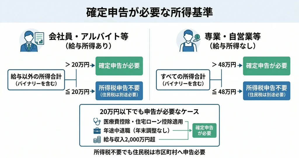 次のセクションでは、どのような場合に確定申告が必要になるのか、具体的な基準を確認していきます。
