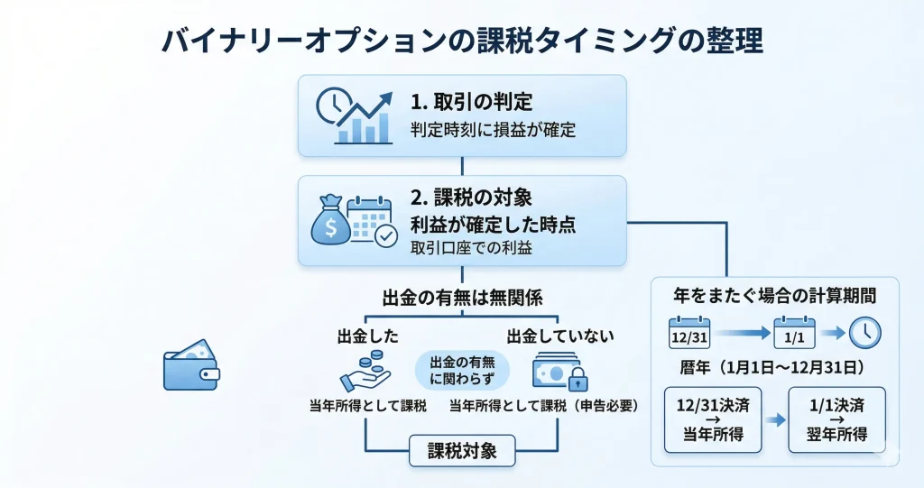 バイナリーオプションの利益は判定時に確定し、出金の有無に関わらず課税対象となる