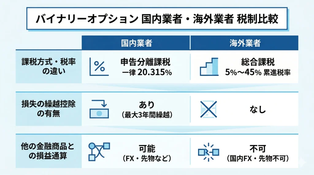 国内業者と海外業者では課税方式・税率・損益通算の可否が大きく異なるため、取引を始める前に自分の取引環境がどちらに該当するかを把握しておくことが重要です。