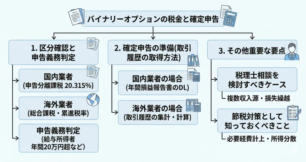 国内業者と海外業者では税制が異なるため、まず自分の取引区分を確認し、申告義務の有無を判断した上で、早めに取引履歴の取得と必要経費の整理を進めることが重要です